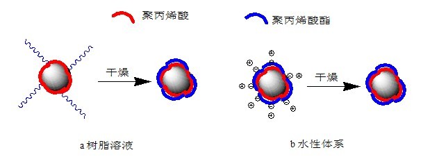 HT A20分子中的錨固部分由(甲基)丙烯酸、磷酸的均聚物或共聚物組成,通過和鈦白粉間的吸引力(配位作用、共價鍵)吸附在粒子表面,將粒子隔離開來。和樹脂相容的穩(wěn)定部分由丙烯酸酯、甲氧基聚丙二醇丙烯酸酯無規(guī)共聚物組成,賦予表面改性后的鈦白粉粒子良好的再分散性,并且能穩(wěn)定均勻分散在樹脂溶液和溶劑揮發(fā)后的樹脂中。在體系干燥過程中以及干燥后,和樹脂相容的部分能包覆在鈦白粉粒子表面,防止粒子聚集,使得鈦白粉粒子在樹脂中能均勻分散。圖2表示改性劑HT A20處理鈦白粉粒子后,HT A20在粒子表面的形態(tài)。圖2a表示在樹脂溶液或溶劑中,干燥前,改性劑的錨固部分和鈦白粉粒子間通過共價鍵、配位鍵結(jié)合在粒子表面上,聚丙烯酸酯部分充分伸展,通過空間位阻作用穩(wěn)定粒子;干燥后,聚丙烯酸酯部分包覆在粒子上或和樹脂基體互相滲透。圖2b表示在水性體系中,干燥前,改性劑的聚丙烯酸錨固部分和鈦白粉粒子間通過共價鍵、配位鍵結(jié)合在粒子表面上,依靠靜電斥力穩(wěn)定粒子;干燥后,聚丙烯酸酯部分包覆在粒子上或和樹脂互相滲透。可見,雙親型嵌段聚合物改性劑HT A20對鈦白粉進行有機表面處理后,在有機溶劑體系和水性體系中,都能提高鈦白粉在介質(zhì)中的分散穩(wěn)定性并改善鈦白粉和樹脂的相容性。